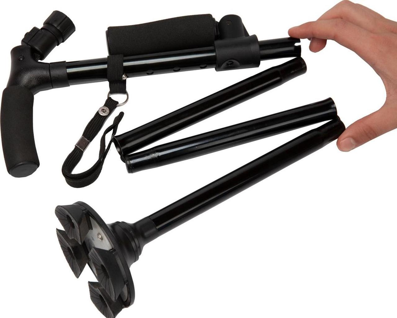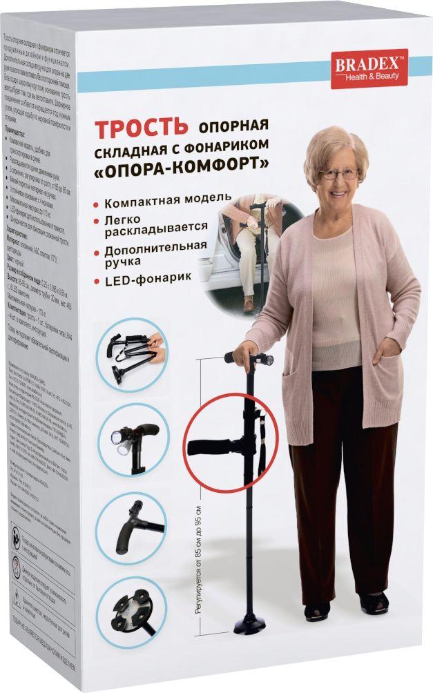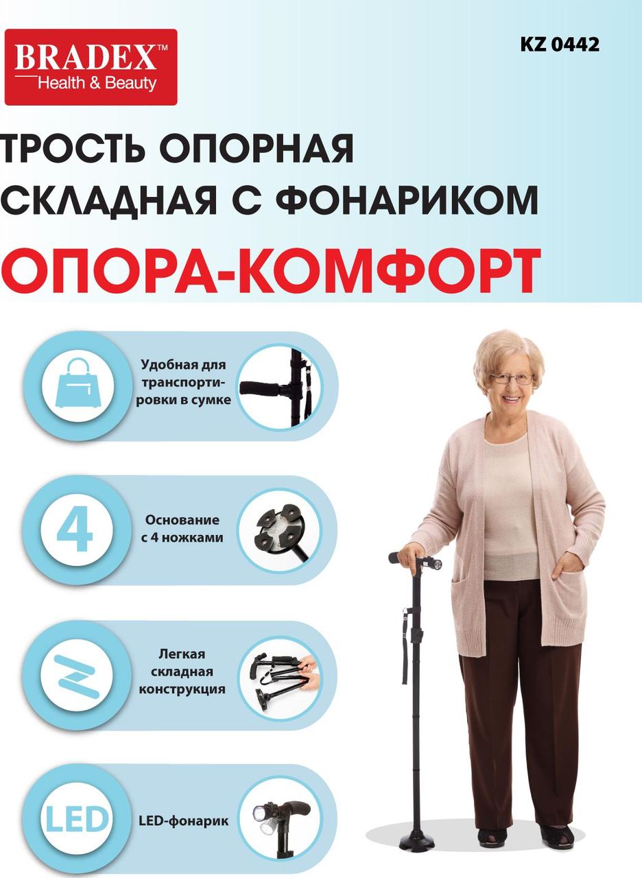 Складная трость с фонариком «Опора-Комфорт» улучшит качество вашей жизни! Раскладывается одним движением. Удобно носить с собой в сумке, зафиксировав специальным шнурком. Инновационный дизайн с двумя ручками для дополнительной поддержки — теперь вставать без посторонней помощи легко! Опорная трость универсальна: регулируется по росту в 5 режимах. Максимальная нагрузка — 113 кг. Благодаря широкому круглому основанию трость всегда будет там, где вы ее поставите. Шарнирное соединение сгибается и вращается под нужным углом, упрощая ходьбу по неровной поверхности и ступеням. Преимущества: Компактная модель, удобная для транспортировки в сумке Раскладывается одним движением руки. 3 сложения, регулировка по росту от 85 до 95 см. Мягкий пористый материал на ручках Устойчивое основание с 4 ножками Максимальная нагрузка — 113 кг. LED-фонарик для использования в темноте Шнурок-петля для фиксации сложенной трости